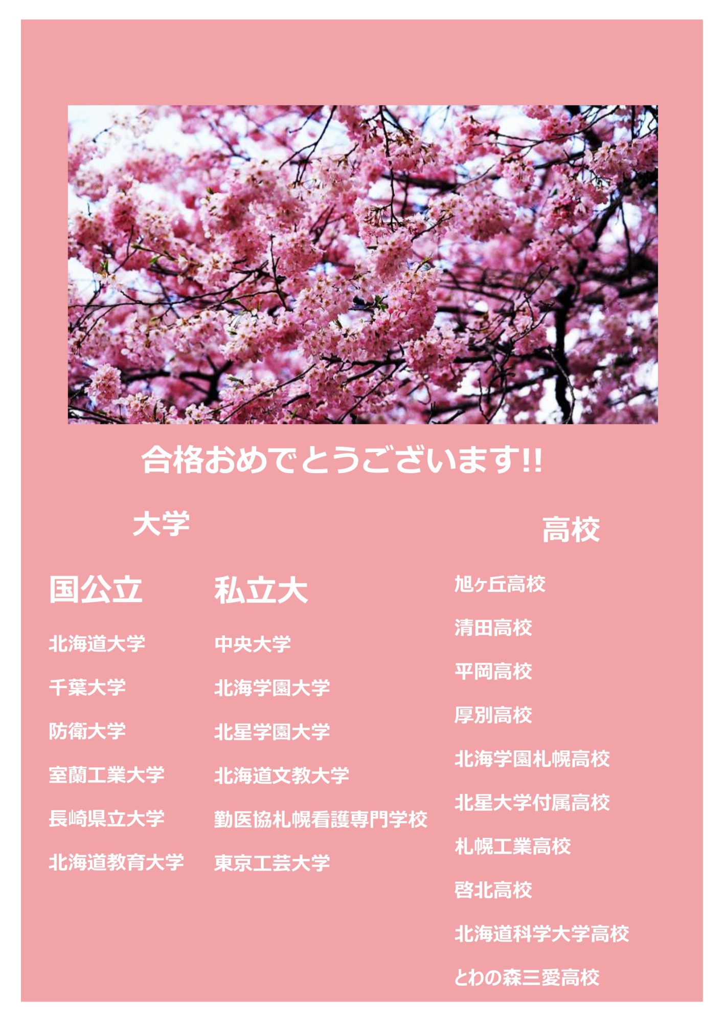 昨年度~今年度の合格実績 ・昨年~今年度の合格実績についてご報告いたします。※当塾に1年以上在籍していた生徒のみ対象 「大学」北海道大学(総合理系)防衛大学(理工学専攻)高崎経済大学(後期)小樽商科大学(昼:商学部)室蘭工業大学(昼:理工学部)室蘭工業大学(推薦型選抜)天使大学(看護栄養学部)北海学園大学(昼:経営学部)北星学園大学(文学部)北海道情報大学(情報メディア学部)特待生「公務員試験」北海道警察 「高校」 平岸高校 大麻高校 平岡高校 大通高校 北海高校 札幌日本大学高校 北海学園札幌高校 北星学園大学付属高校 静修高校 龍谷高校 新陽高校 クラーク記念国際高等学校 合格おめでとうございます!!